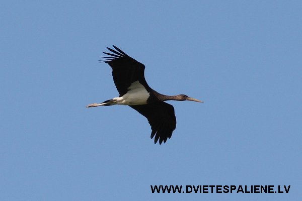 Black Storks Ciconia nigra, nesting in surrounding forests, fly to feed in Dviete floodplain waters.