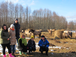 Netālajā aplokā pie siena ruļļiem gremoja neliels bariņš govju ar iespaidīgiem ragiem. Gide pastāstīja par likumiem ganāmpulkā un, ievērojot piesardzību, drīkstēja nedaudz pietuvoties dzīvniekiem. Tāpat nedaudz tālāk, citā aplokā savus sānus saulītē sildīja zirgu pulciņš. Te valda citi likumi un robežas ir iespaidīgi apzīmētas. Par tūristu bariņu ieinteresējās daži ērzeļi, bet ķēves ar dūšīgiem vēderiem noskatījās dīvainajos cilvēkos. Ķēvēm citas rūpes – gaidāmi piedzimstam šā gada pirmie kumeliņi. Pēc nelielās pastaigas iepazināmies ar bebra dzīves noslēpumiem un saimnieces mūs pacienāja ar siltu tēju un ievārījumu.